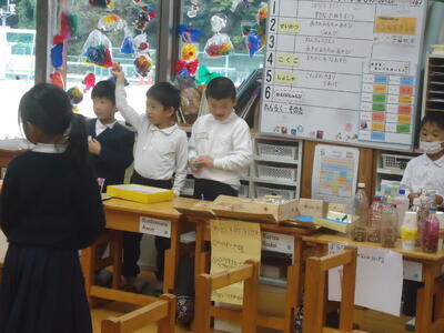 1年生は、こども園あさひの年長さんを招待して「秋のおもちゃ遊び」を開きました。