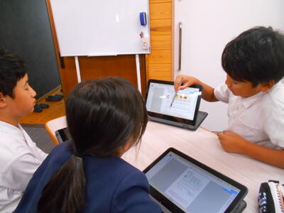 タブレットで配布された資料にグループで共同編集したものを示しながら説明していました。